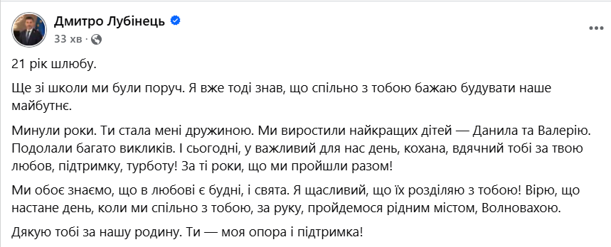 «21 рік шлюбу. Ще зі школи ми були поруч. Я вже тоді знав, що спільно з тобою бажаю будувати наше майбутнє. Минули роки. Ти стала мені дружиною. Ми виростили найкращих дітей – Данила та Валерію. Подолали багато викликів. І сьогодні, у важливий для нас день, кохана, вдячний тобі за твою любов, підтримку, турботу! За ті роки, що ми пройшли разом!», – написав Лубінець.