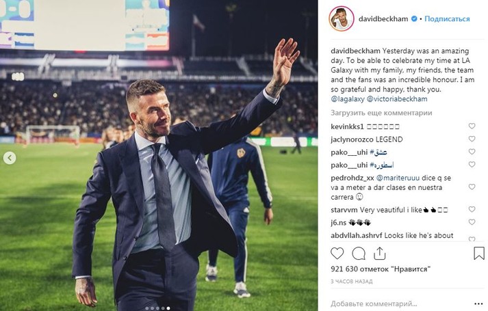 Один из самых необычных подарков преподнесла команда L. A. Galaxy, за которую Дэвид играл с 2007 по 2012 год. Рядом со стадионом Home Depot Center футбольный клуб установил огромный бронзовый монумент, изображающий бегущего по полю Бекхэма.