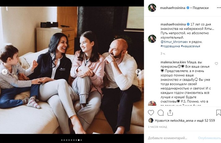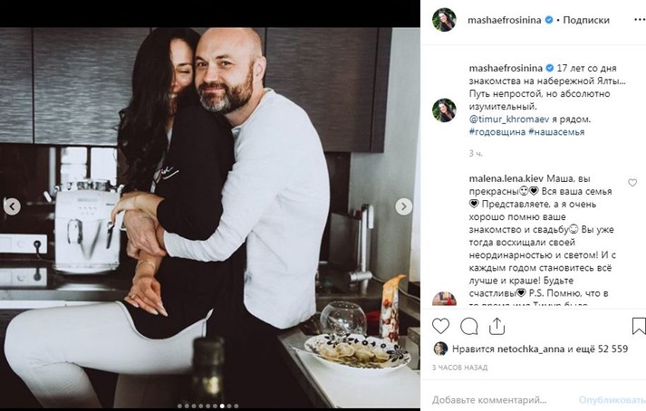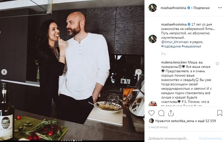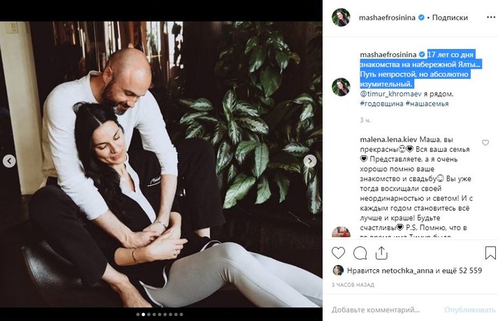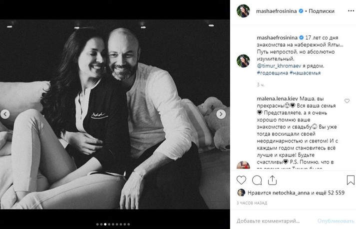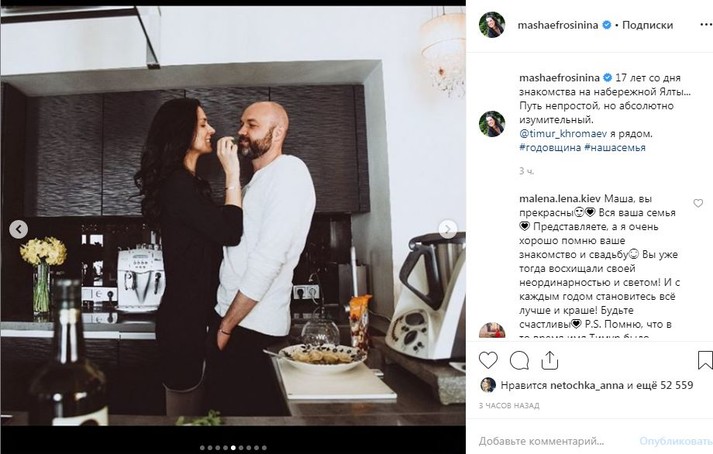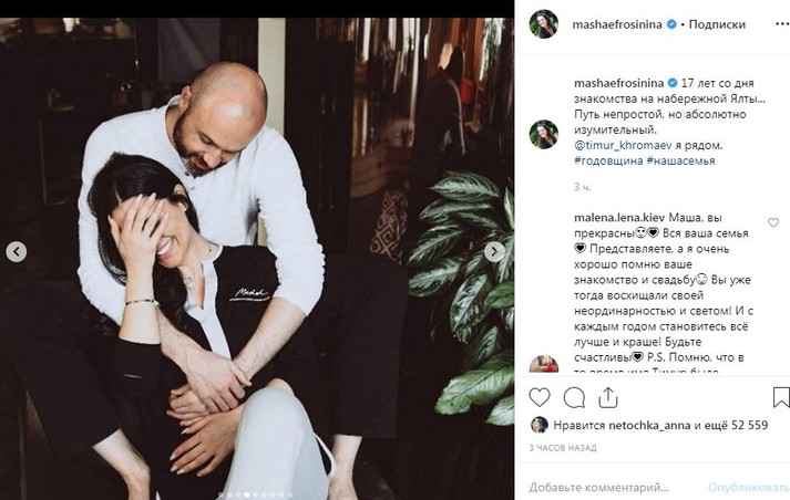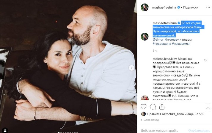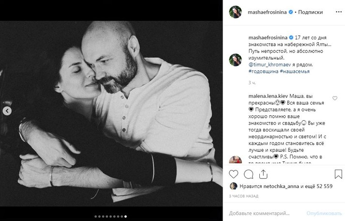 «17 лет со дня знакомства на набережной Ялты... Путь непростой, но абсолютно изумительный. Я рядом, Тимур Хромаев», - трогательно написала Ефросинина на своей странице в соцсети.