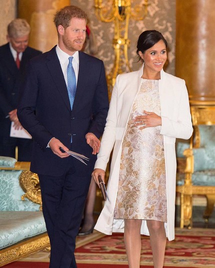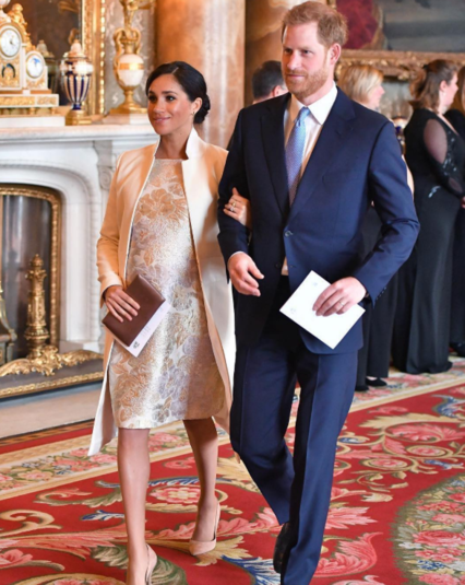А вот на Меган Маркл было роскошное жаккардовое платье, украшенное расшитыми серебристыми и золотистыми цветочными узорами. Поверх него герцогиня Сассекская одела белый плащ Amanda Wakeley. На ногах - розовые лодочки Paul Andrews. Модный ансамбль герцогиня дополнила клатчем Wilbur&Gussie бронзового оттенка.