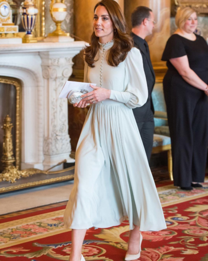Как всегда, особо пристальное внимание гостей было приковано к Кейт Миддлтон, жене принца Уильяма, и супруге его младшего брата Гарри Меган Маркл. А она, надо отметить, просто блистали. Так, Кейт появилась на публике в нежно-голубом платье средней длины с пышными, объемными рукавами и светлых замшевых лодочках Emmy London. Образ дополнял клатч Alexander McQueen, который был подобран в тон платью, и серьги Aquamarine.