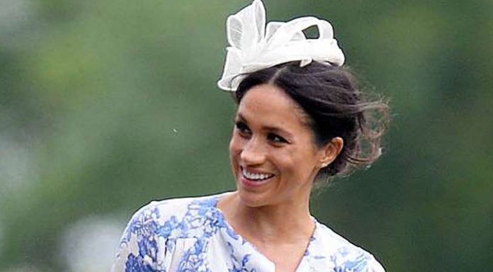 Для торжественного мероприятия герцогиня выбрала воздушное и очень женственное платье в пол украшенное голубыми принтами. На голове у Меган Маркл была оригинальная шляпка, которая придала образу элегантности и утонченности.