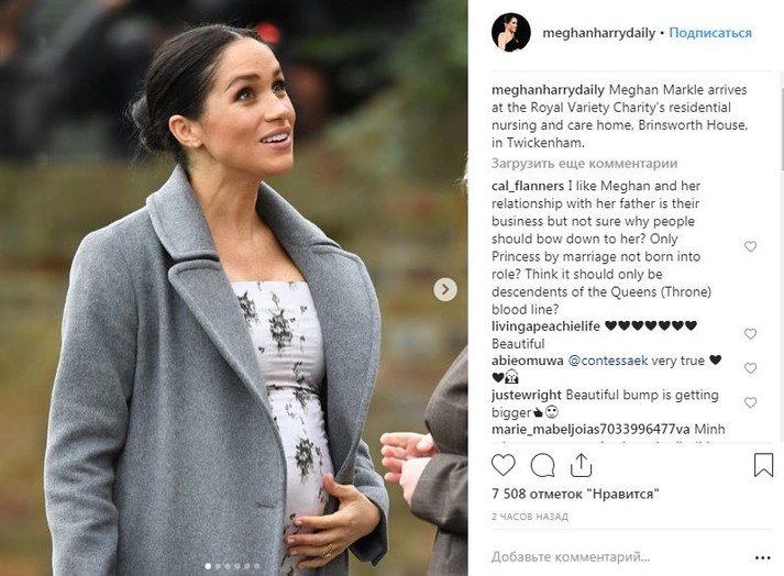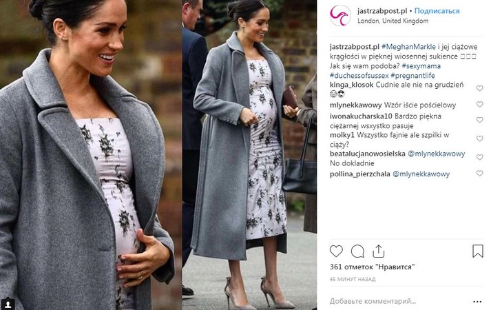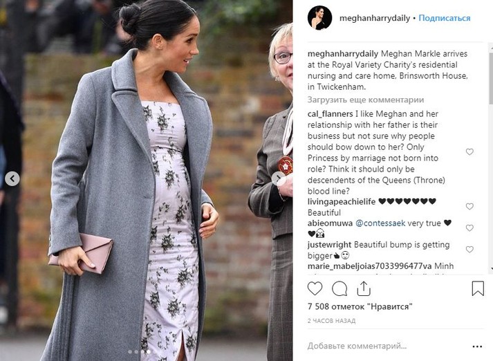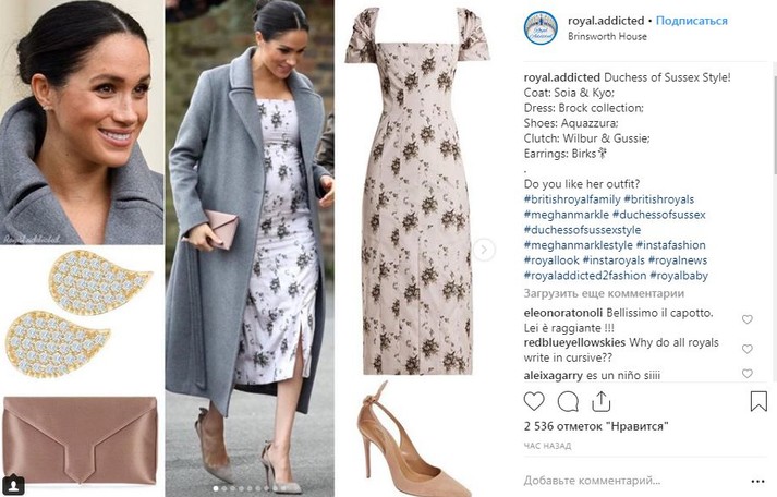 Для выхода в свет Меган выбрала белое платье с цветочным принтом за 850 фунтов стерлингов, а также серое пальто за 550 фунтов. Дополнила же образ герцогиня своими любимыми лодочками Aquazzura: Меган часто носит именно эту модель в черном и нюдовом цвете.