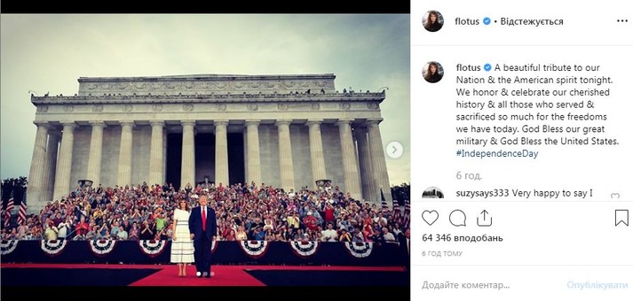 4 июля в Америке отмечали национальный праздник День независимости. По такому случаю в историческом центре Вашингтона состоялось праздничное мероприятие, которое посетила чета Трамп.