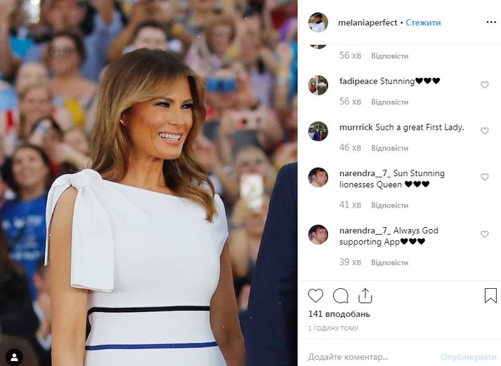 Перед публикой 49-летняя Мелания появилась в образе с иголочки. На ней было белое платье Carolina Herrera в разноцветную полоску, которое идеально село на ее стройную фигуру. Летний элегантный образ первая леди США дополнила лодочками цвета фуксия