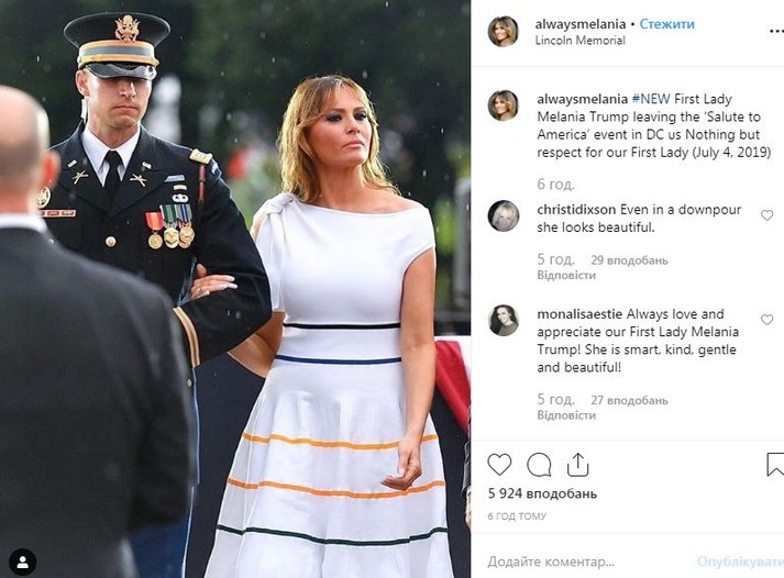 Мелания Трамп отметила День независимости в стильном луке от Carolina Herrera и с мокрой головой