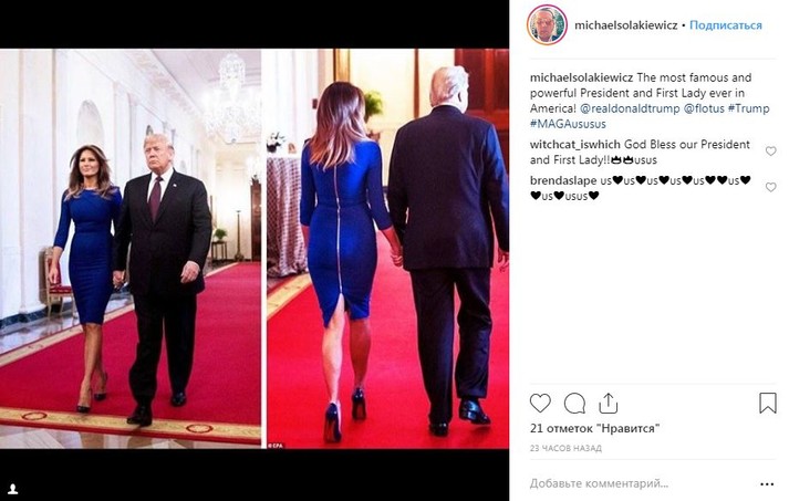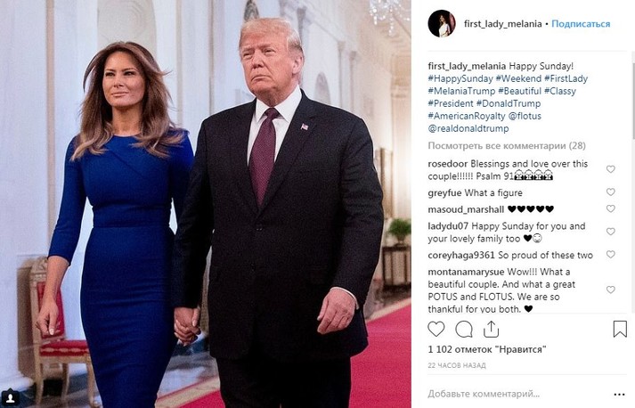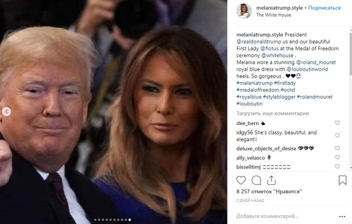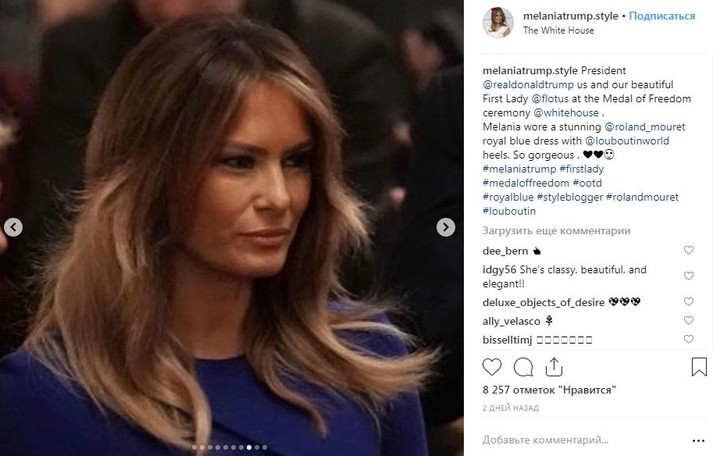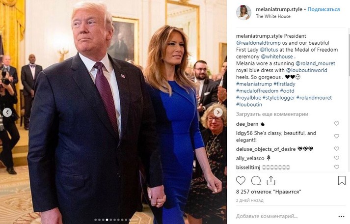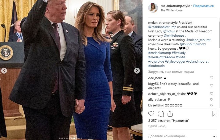 В этот день в Белом доме была и Мелания Трамп. Первая леди США поддержала супруга в ярко-синем платье-футляре Roland Mouret и черных лаковых туфлях-лодочках Christian Louboutin.