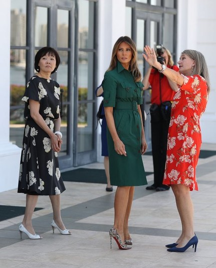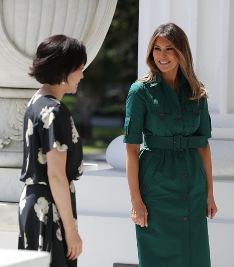 Напомним, ан предыдущие встрече с премьер-министром Японии и его супругой первая леди США надела эффектное платье-миди Carolina Herrera в черно-белую полоску. Легкий весенний образ супруга Президента дополнила белыми туфлями на каблуках от бренда Christian Louboutin. Макияж с акцентом на глаза и идеально уложенные волосы завершили изящный образ Мелании Трамп.