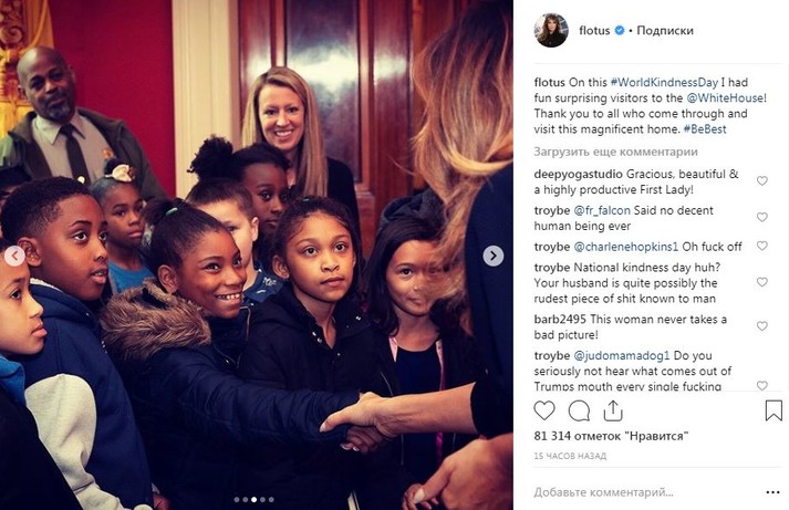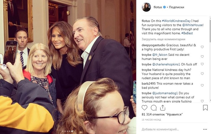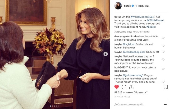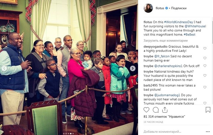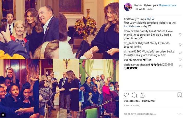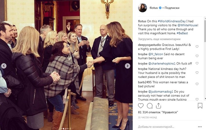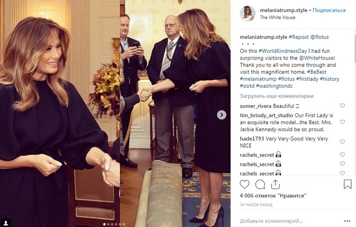 «В этот Всемирный день доброты мне было очень забавно удивлять посетителей Белого дома. Спасибо всем, кто пришел посмотреть этот прекрасный дом», — написала Мелания в Instagram.