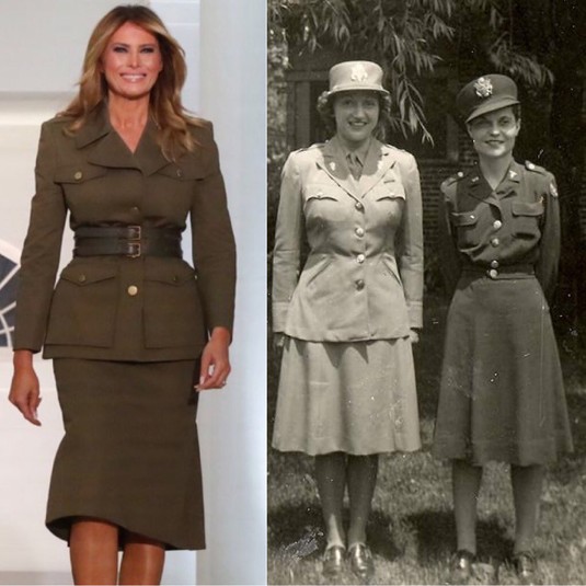 Первая леди надела жакет в стиле милитари с длинными рукавами и пояс с двойной перевязкой вокруг талии, демонстрируя фигуру в виде песочных часов. На жакете были большие лацканы с золотой отделкой. Мелания также выбрала для выступления туфли на каблуках с острым носком.