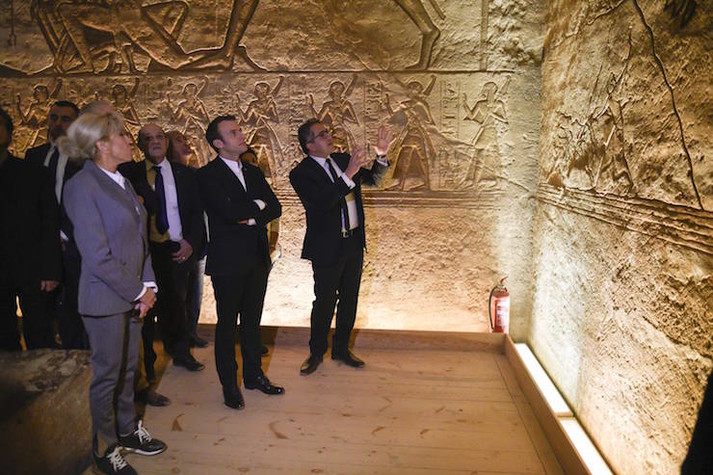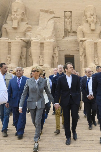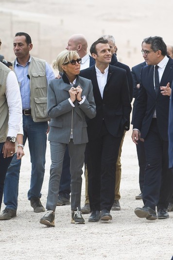 Брижит и Эмануэль Макрон приехали с официальным визитом в Египет, где они посетили несколько древних храмов. Для осмотра святых мест первая леди выбрала комфортный наряд из серого брючного костюма Louis Vuitton, который дополнила кроссовками.