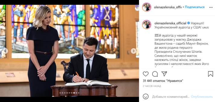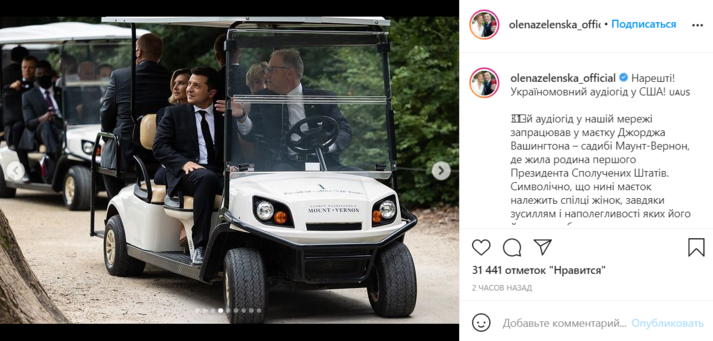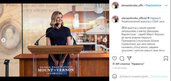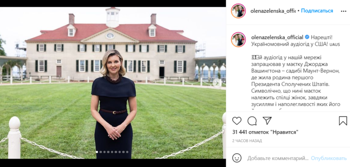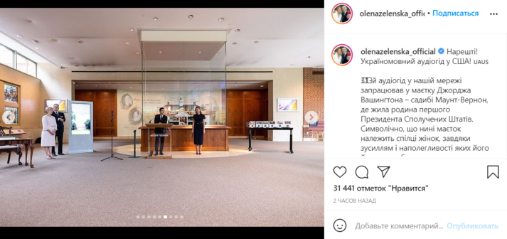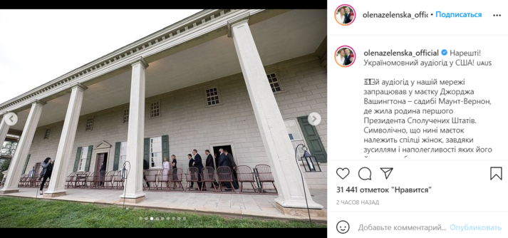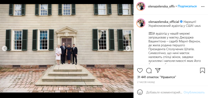 Президентская чета появилась в усадьбе Маунт-Вернон, которая принадлежала первому президенту США Джорджу Вашингтону. Сейчас поместье, расположенное в 20 километрах от Вашингтона, принадлежит союзу женщин. Именно в нем по инициативе Елены Зеленской заработал первый украиноязычный аудиогид в США.