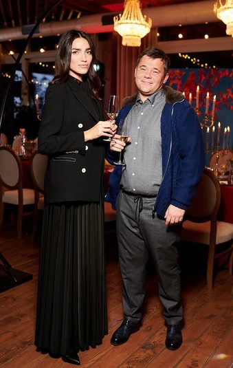 Богдан был в вязанном кардигане с норковым воротником, трикотажной рубашке и брюках в стиле кэжуал. Его спутница во всем черном: коктейльном платье замысловатого кроя и жакете поверх.