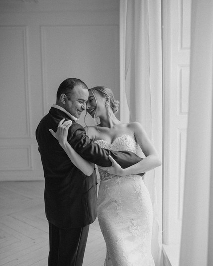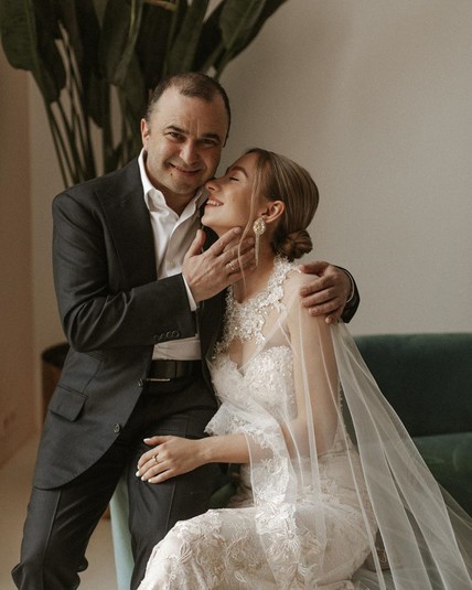 На снимках Виктор Франкович предстает в костюме и белой рубашке, а его возлюбленная – в нежном обтягивающем платье молочного цвета с длинной прозрачной накидкой.