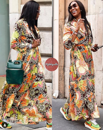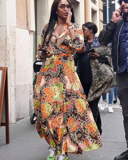 Наоми была в хорошем настроении и непринужденно улыбалась фотографам. К долгой прогулке по вечному городу знаменитость подготовилась основательно: вместо туфель на каблуках Кэмпбелл предпочла комфортные яркие кроссовки, которые отлично дополнили ее платье с цветочным принтом и узорами.