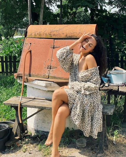 Настя Каменских игриво обнажила плечи и ножки у колодца (фото)