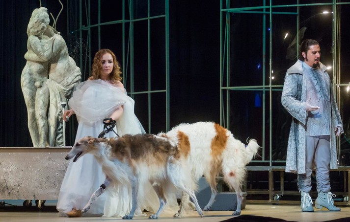 Еще больше поражают абсолютно нелогичные мизансцены. Совершенно очевидно и логично, что прежде чем воскликнуть: Padre mio!!!, Альфред должен увидеть своего, только что вошедшего отца. Это же так просто! Но у Альфреда Лавренчука, видимо, есть глаза на затылке. Во втором действии служанка Аннина вывела двух собак породы русская псовая борзая и пришвартовала их к фонтану, на котором недавно валялся Альфред, изображая свою безмятежную жизнь. Вскоре собачек увели. Спрашивается, зачем они нужны действию?