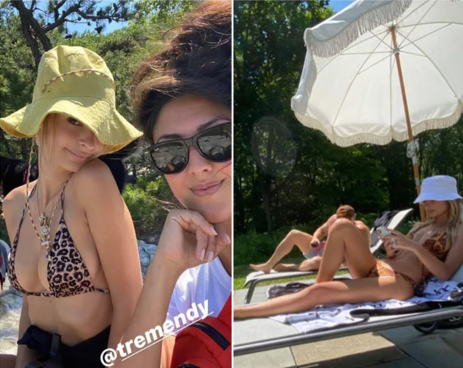 Эмили также примерила золотой купальник с узорами. В этом образе Ратаковски отдыхала на шезлонге. Звезда с комфортом устроилась в тени, а стройные ножки выставила на солнышко. Рядом с моделью загорал ее муж.