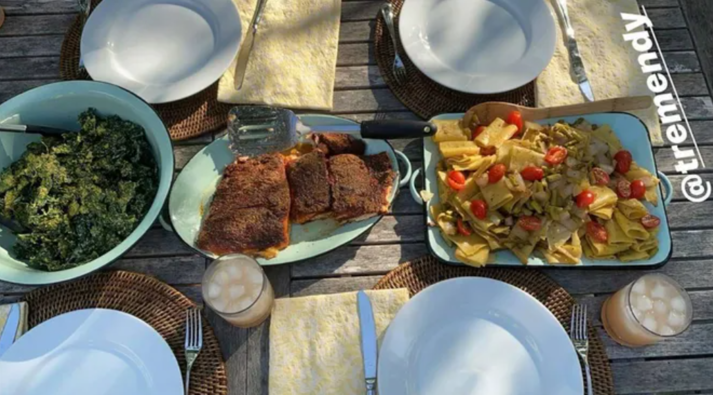 Позже Эмили и ее спутники устроили пикник. Модель засняла свой обед - салат, вегетарианскую пасту и пирог.