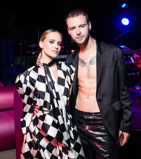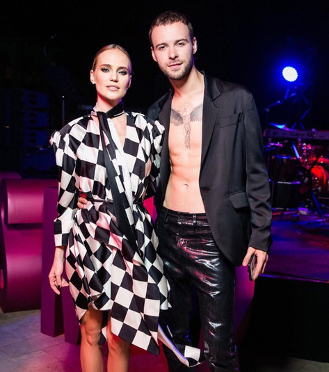 Макс Барских выбрал для выступления полностью черный look. На него были надеты черный расстегнутый пиджак на голое тело и блестящие кожаные брюки. Стоит отметить, что пара очень гармонично смотрелась вместе.