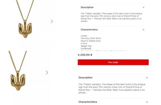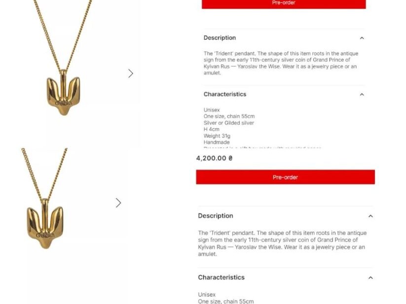 У столиці Польщі дружина Зеленського зʼявилася в елегантному ансамблі відтінку бордо українського бренду A.M.G. Образ першої леді складається із двобортного пальта і сукні в тон. До ансамблю Олена Зеленська додала золоті сережки та особливий аксесуар українського бренду Gunia Project – кулон-амулет Тризуб. Такий кулон на сайті компанії коштує від 4 до 13 тисяч гривень. Вартість прикраси залежить від її розміру. Кулон у формі тризуба продається разом із ланцюжком.