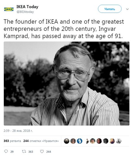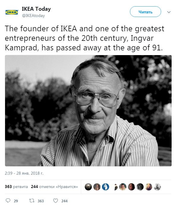 «27 января основатель Ikea и Ikano и один из величайших предпринимателей XX века Ингвар Кампрад ушел из жизни в своем доме в Смоланде (Швеция), в окружении своих близких», - отметили в пресс-службе компании на официальной странице в соцсети.