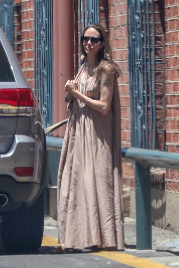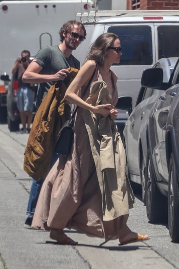 Папарацци «поймали» бывшую супругу Брэда Питта у медицинского центра в районе Беверли-Хиллз. Анджелина выбрала для выхода неприметный образ. Она была одета в бежевый сарафан свободного кроя, а в руках несла тренч более холодного оттенка. На ноги актриса надела привычные кожаные шлепки — комфорт и стиль в одной вещи. Завершили нюдовый образ темные солнцезащитные очки и черная сумка через плечо.