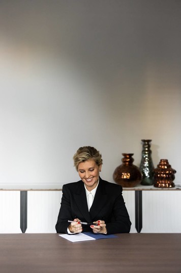 На первом кадре видно, что Зеленская смотрит прямо в объектив. А на втором она радостно и искренне улыбается, держа в руках ручку.