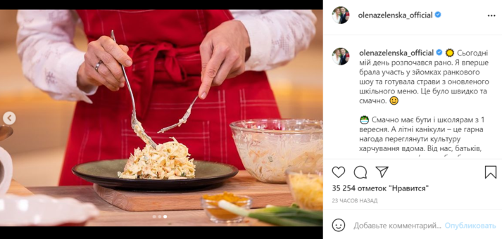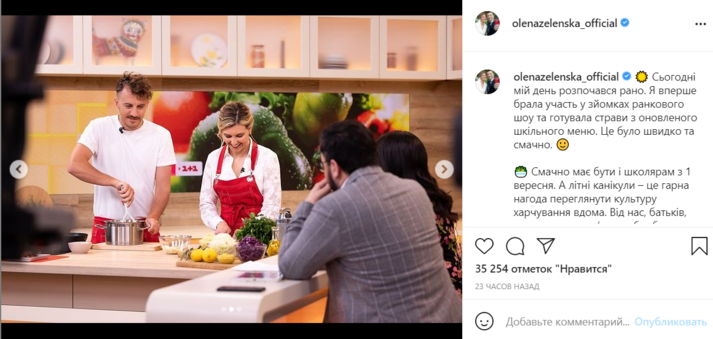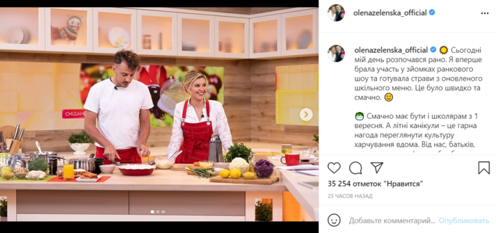 Елена Зеленская появилась в прямом эфире утреннего шоу «Сніданок 1+1», где вместе с кулинарным экспертом, автором и руководителем проекту Cult Food Евгением Клопотенко приготовила три блюда из нового школьного меню. В частности, они приготовили: вегетарианский закрытый пирог; салат с яйцом, сыром и куркумой; салат с красной капусты с соусом винегрет.
