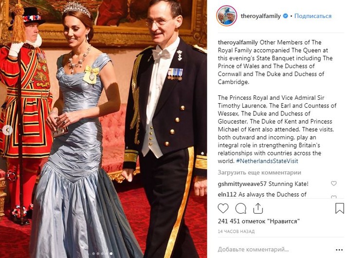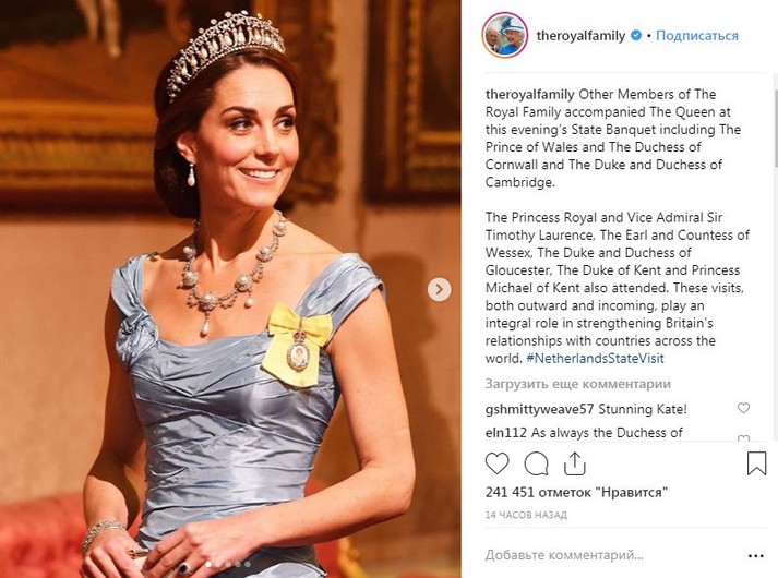 Согласно протоколу, на дипломатический банкет все представительницы монарших династий с обеих сторон должны были надеть тиары и ордены. К слову, Кейт Миддлтон впервые надела свой - королевский фамильный орден Елизаветы II. Такой же носит супруга принца Эдварда, графиня Уэссекская Софи, герцогиня Корнуольская Камилла Паркер-Боулз и принцесса Анна. Орден представляет собой портрет молодой королевы Елизаветы на желтой ленте, ограненный драгоценными камнями. Носят его строго на левой стороне груди.