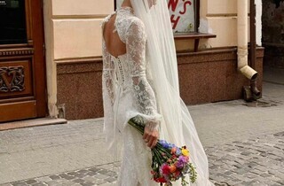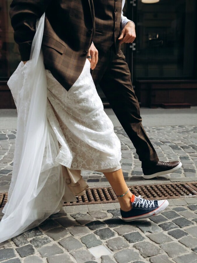 Образ пари також став частиною святкової історії: Павло Вишебаба обрав костюм у клітинку з білою сорочкою та темною краваткою, тоді як Анжеліка Кравець з’явилася у білій мереживній сукні з довгими рукавами та фатою. Контраст класики й невимушеності підкреслювали кеди на ногах нареченої, які додали образу сучасного настрою.