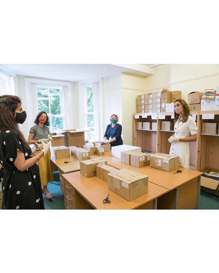 Во время распаковки вещей Миддлтон надела средства защиты — соблюдение этих мер крайне необходимо во время пандемии коронавируса. Супруга принца Уильяма подобрала маску с нежным цветочным принтом, которая идеально сочеталась с ее образом.