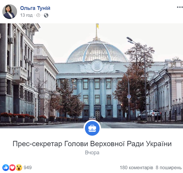 В свою очередь, Туний на своей странице в Facebook подтвердила, что стала пресс-секретарем главы Верховной Рады.