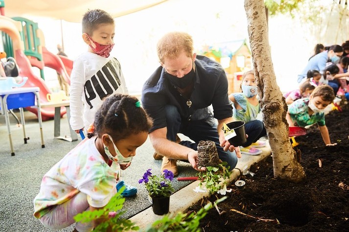 Меган и Гарри вместе с малышами облагородили сад их образовательного центра. Для садоводческой работы Маркл выбрала рубашку из светлого денима и джинсы с балетками. Лица супругов были закрыты защитными масками.