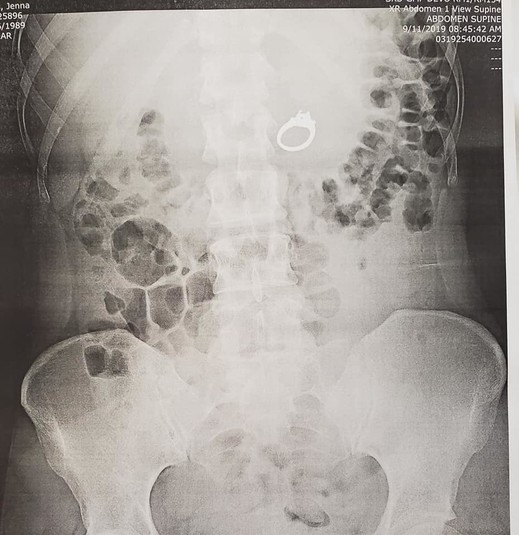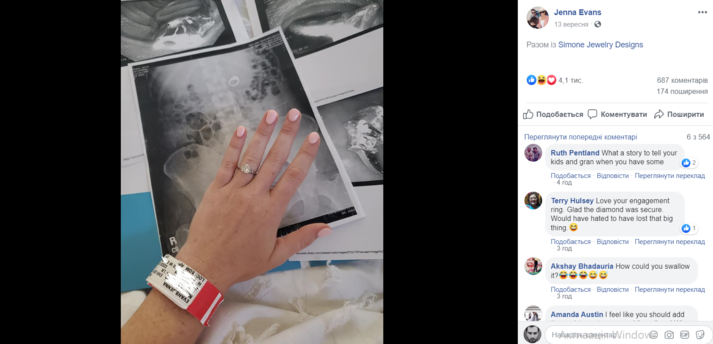 Рентген показал, что кольцо с бриллиантом в 2,4 карата действительно находится в ее желудке. Врачи решили, что неразумно ждать, пока кольцо выйдет естественным путем, и назначили операцию. Она прошла успешно.