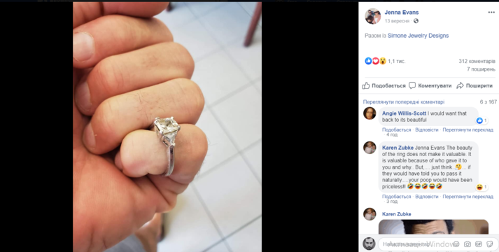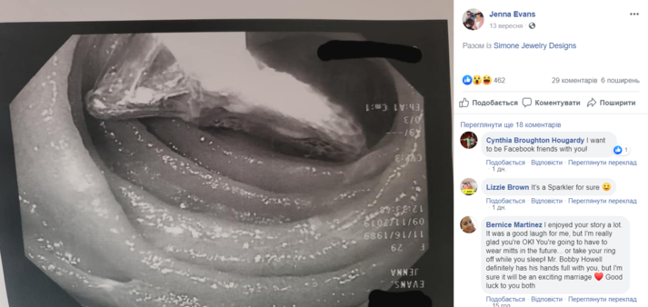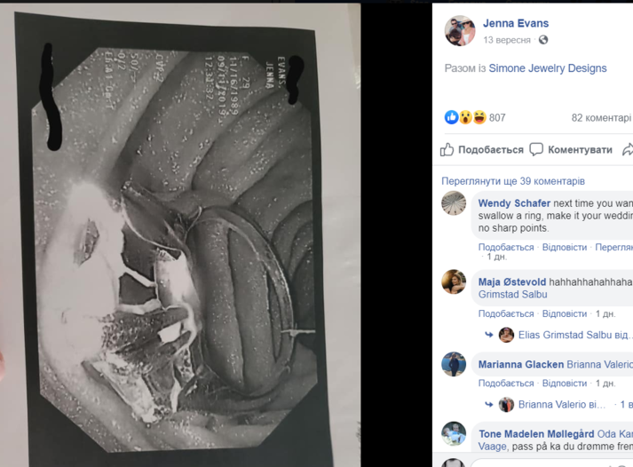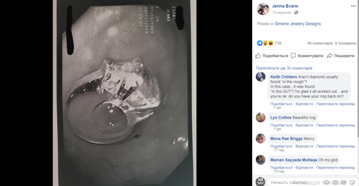 29-летней жительнице США Дженне Эванс потребовалась операция после того, как она проглотила во сне кольцо с бриллиантом, полученное на помолвку. Об этом сообщает BBC.