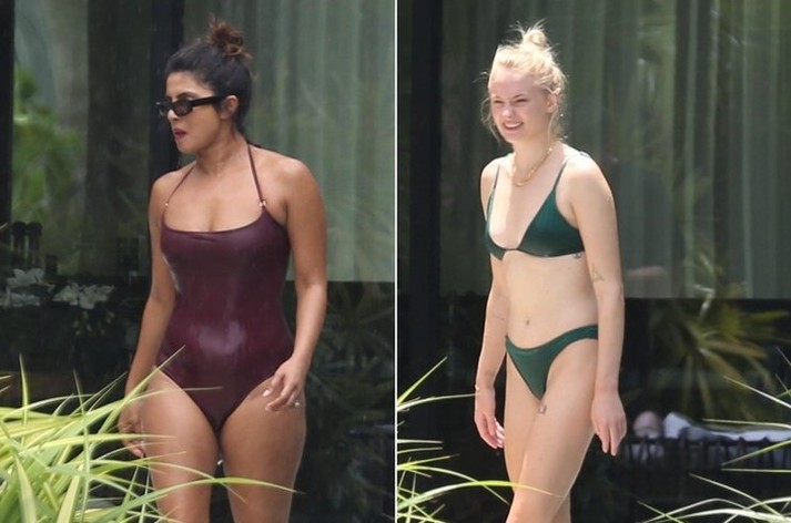 37-летняя Приянка Чопра и 23-летняя Софи Тернер развлекаются без мужей в Майами. Папарацци запечатлели звезд во время купания. Приянка появилась перед объективами фотографов в бордовом монокини, а Софи – в бикини изумрудного оттенка.