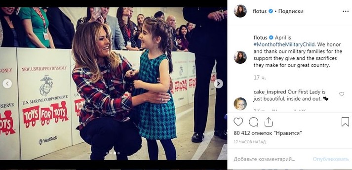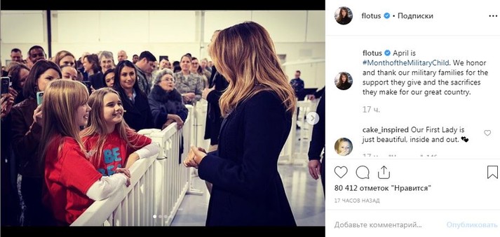 «Больше честь поблагодарить семьи, которые даже страдают ради улучшения жизни в нашей стране», — написала Мелания, сопроводив пост тегом #MonthoftheMilitaryChild.