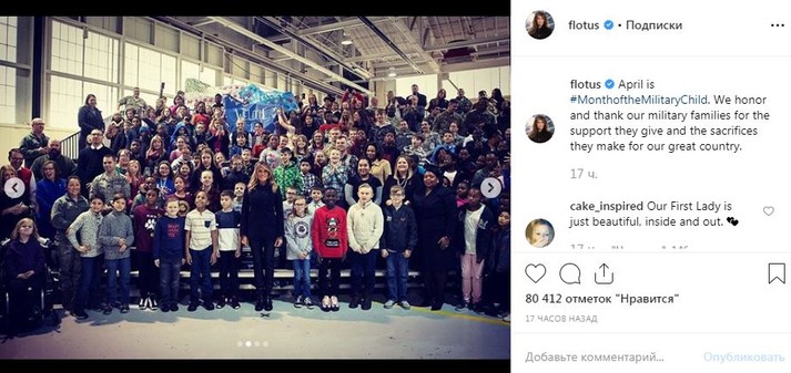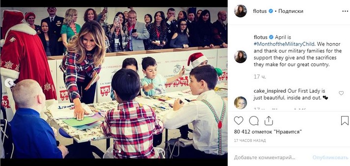 Апрель в расписании Мелания Трамп посвящен семьям военнослужащих. 8 апреля супруга Дональда Трампа встретилась с детьми, которые растут в семьях военных. Первая леди опубликовала несколько фото в Instagram, на которых показала как прошло мероприятие. Она общалась с представителями младшего поколения, рисовала и играла с ними.