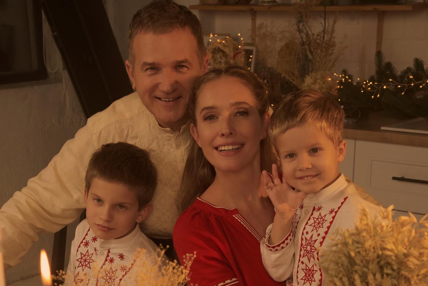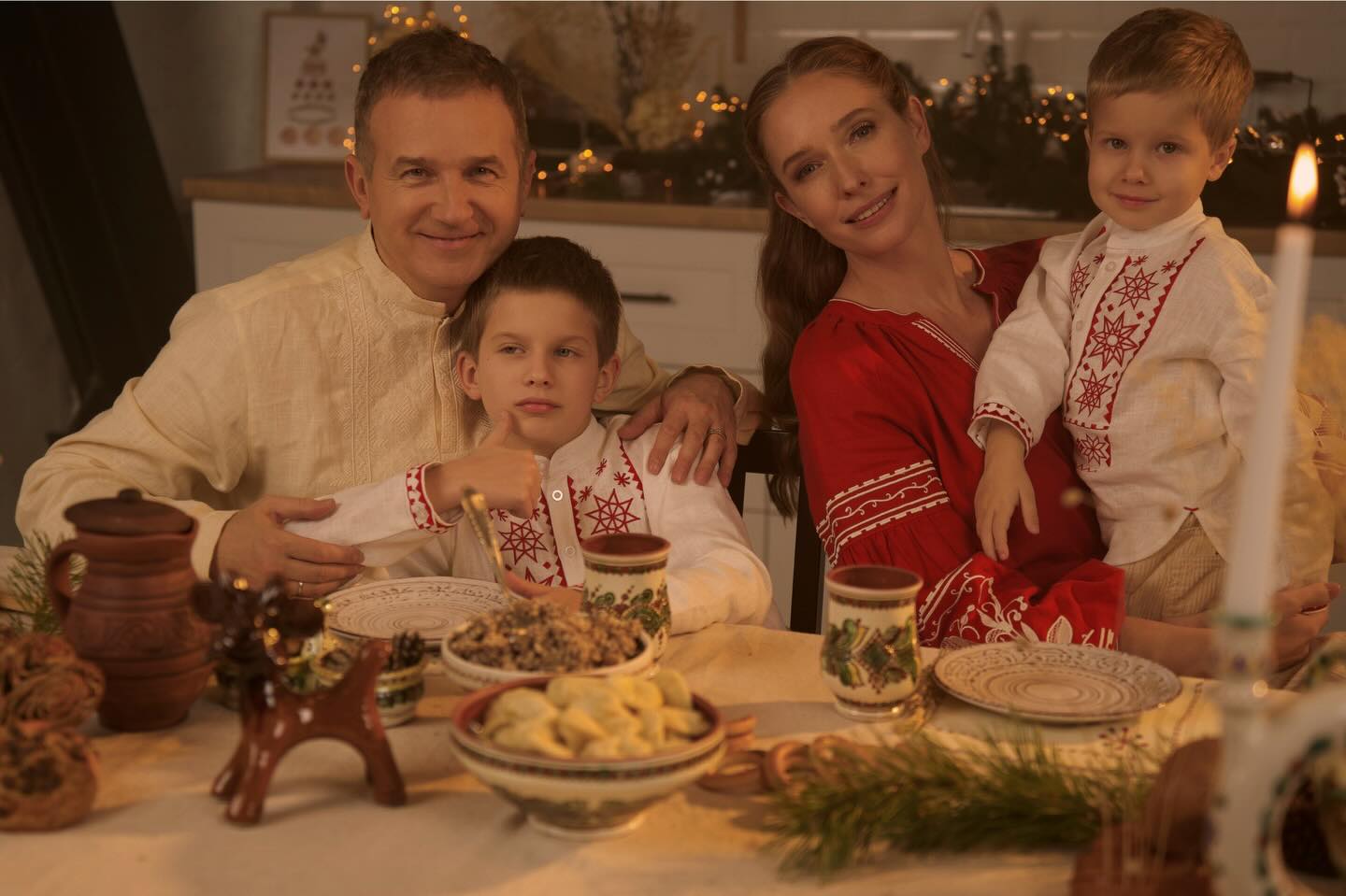 На світлині подружжя разом з дітьми Іваном та Данилом одягнені в національні вишиванки. Вони сидять за святковим столом, на якому розкладені традиційні страви, серед яких вареники та кутя.
