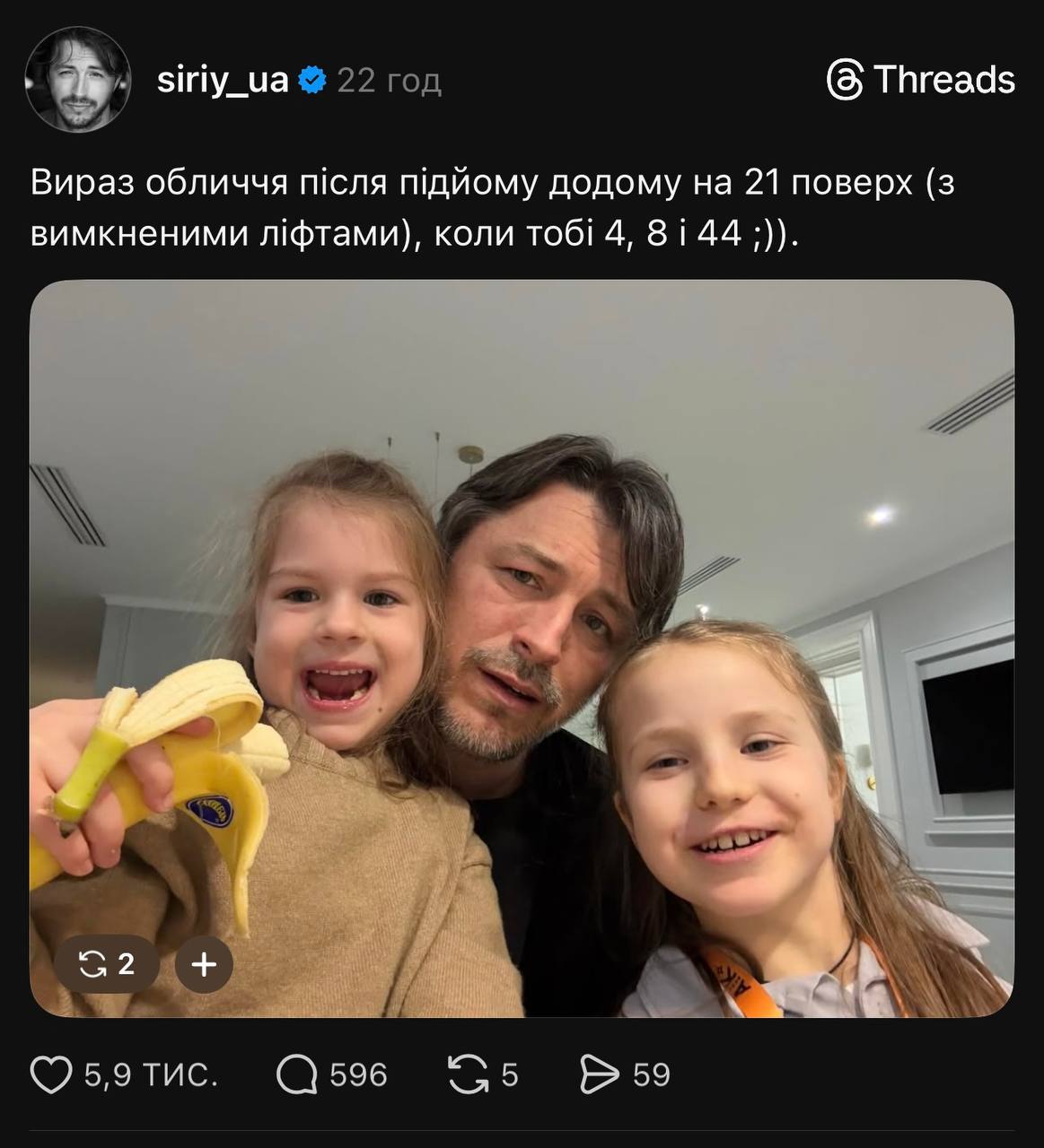 Ексведучий та волонтер Сергій Притула поділився у мережі світлиною з доньками. Колишній шоумен показав, які він та його діти виглядають після «сходження» на 21 перший поверх пішки через відсутність світла. Українці в коментарях під дописом пожартували з цього приводу та поділилися своїми історіями. Про це пише «Главком» із посиланням на Threads.