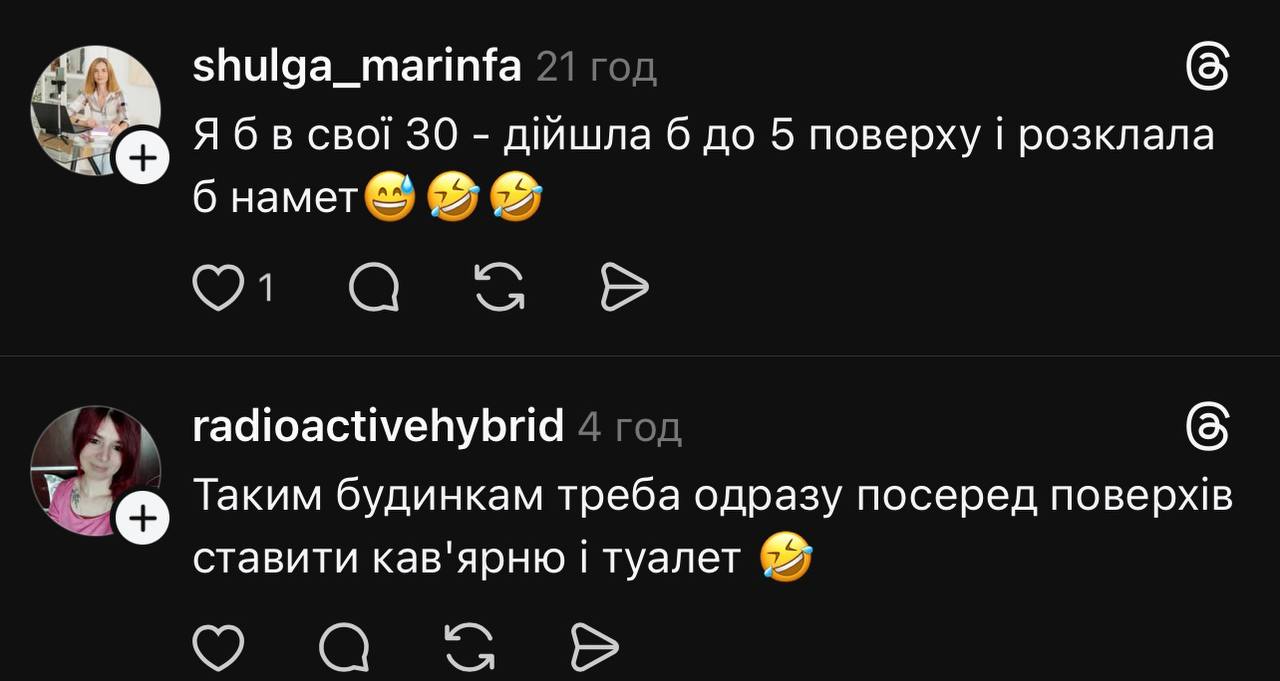 У коментарях українці назвали підйом на 21 поверх пішки «сходженням». Деякі користувачі пожартували, що для багатоповерхових будинків потрібно зробити кав’ярню посеред поверхів, щоб відпочивати, піднімаючись до своєї квартири.
