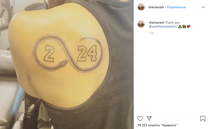 Шария Вашингтон показала сегодня тату, которое она сделала на предплечье в память о своем легендарном брате и его дочери. Это изображение змеи мамбы, которая извивается в форме восьмерки, или знака бесконечности. Коби сам придумал себе псевдоним Черная Мамба. Так же называлась его академия баскетбола.