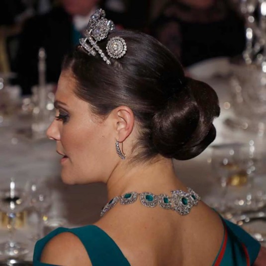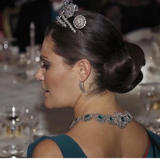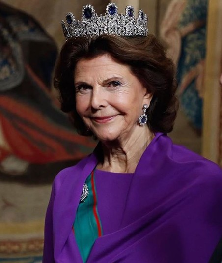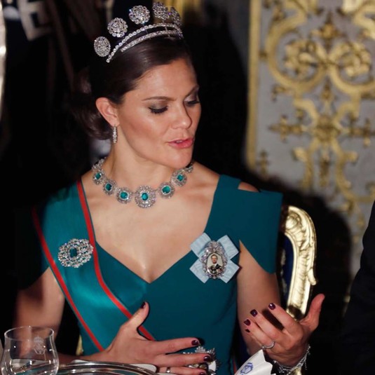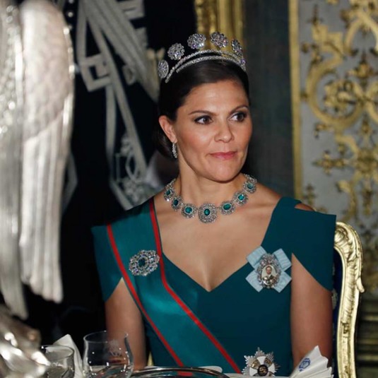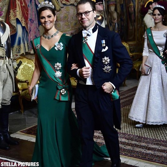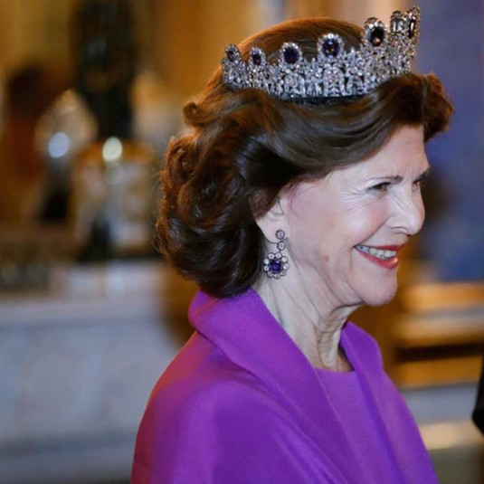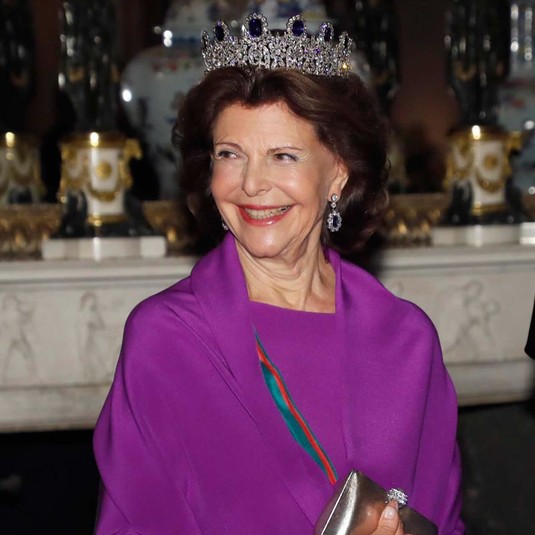 Кронпринцесса Виктория надела темно-зеленое платье и любимую тиару принцессы Кристины, сестры короля Карла XVI Густава. Королева Сильвия выбрала, наверное, самый яркий образ: фиолетовое платье, Лейхтенбергскую сапфировую тиару и серьги из комплекта.