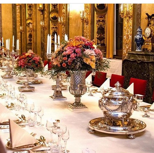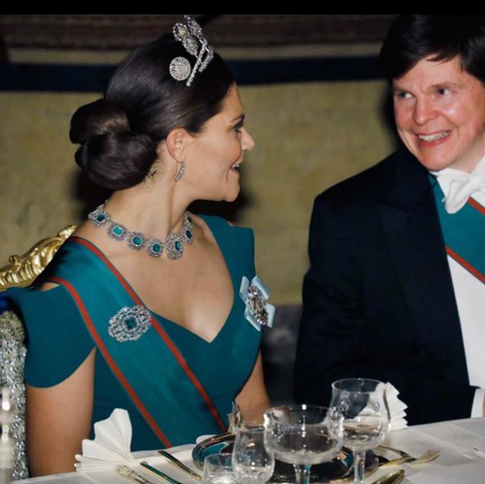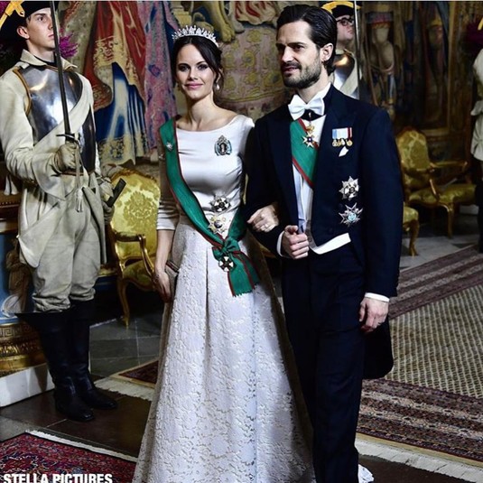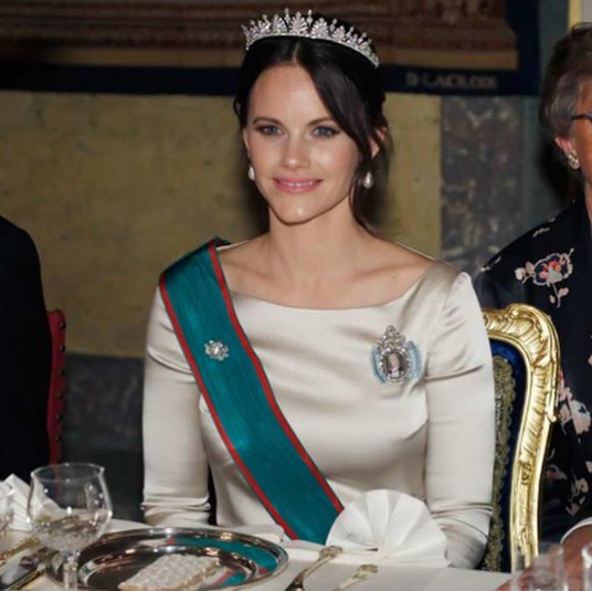 Принцесса София вошла в зал в белом платье и под руку с мужем. Свой вечерний образ она украсила тиарой, которую носила на собственной свадьбе три года назад. Эту тиару она получила в подарок от короля и королевы. После свадьбы София несколько раз выходила в ней в свет по особым поводам и иногда видоизменяла украшение — носила его без изумрудов.