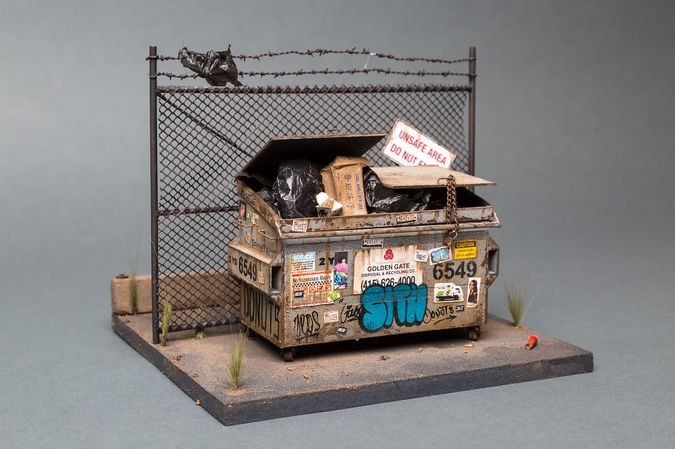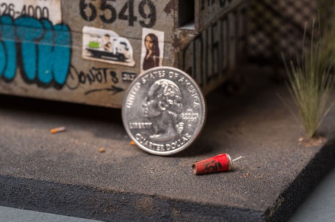 Внимательно присмотревшись к маломасштабным композициям, можно увидеть крошечные рекламные баннеры, граффити на стенах, ржавчину на домах, жвачку на тротуаре, микроскопические стаканы кофе и даже окурки в мусорном баке. Множество мелких деталей создают реалистичную атмосферу городских пейзажей, передают ритм жизни мегаполисов. На создание одной композиции у художника уходит от нескольких дней до нескольких месяцев кропотливого труда, в зависимости от габаритов. Самый большой объект может уместиться на двух ладонях.