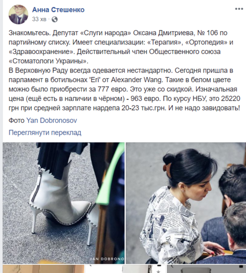 Нардеп от партии «Слуга народа» Оксана Дмитриева пришла на работу в Раду в дорогой брендовой обуви. Сообщается, что народная избранница выбрала для рабочего лука ботильоны Eri от Alexander Wang. Их стоимость колеблется от 777 до 963 евро. Об этом сообщила журналистка Анна Стешенко в своем Фейсубке.