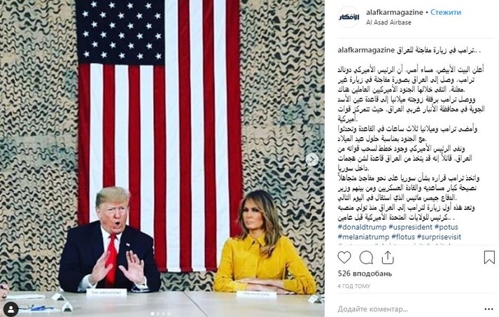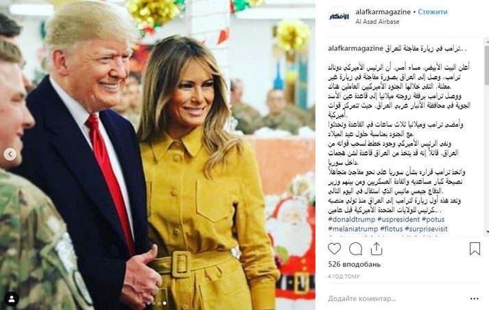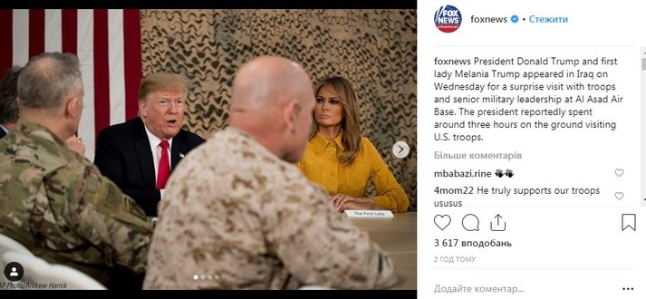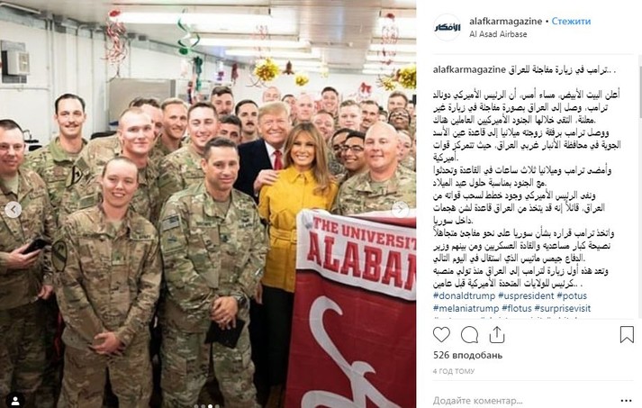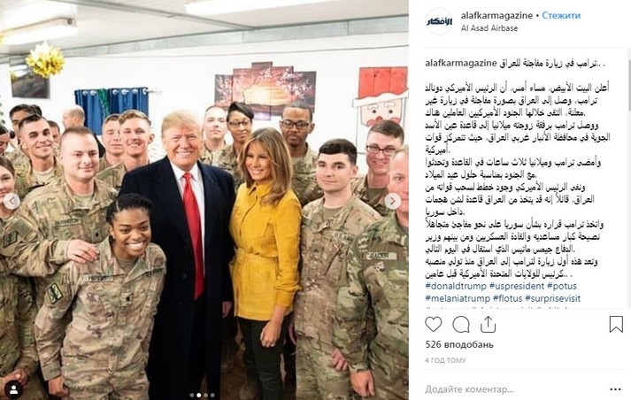 Вчера, сразу после семейного рождественского обеда, не дожидаясь официального окончания праздничных каникул, Дональд и Мелания зашли на борт самолета и были доставлены в Ирак. Там они решили поздравить служащих американских войск, размещенных на авиабазе Аль-Асад. Визит стал неожиданностью для военных, так как Трампы не планировали его, как все другие официальные поездки, заранее.