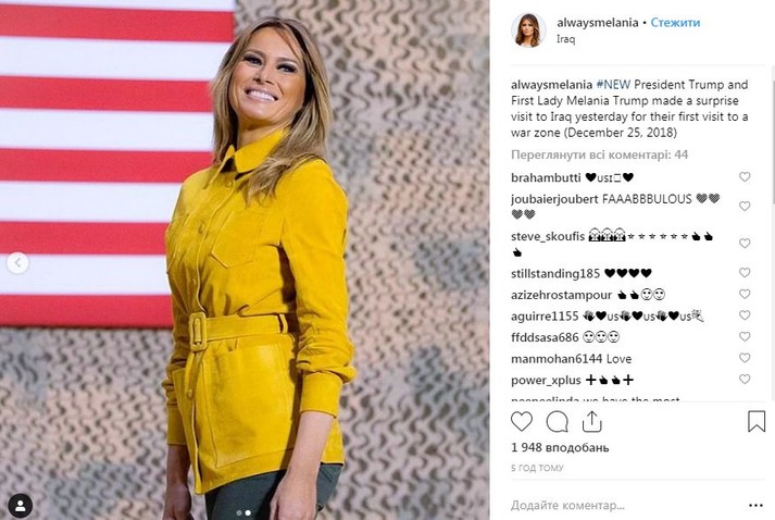 Для Дональда Трампа как президента этот визит в Ирак стал первым. А Мелания Трамп стала единственной первой леди США, отправившейся в Ирак, где американцы ведут боевые действия уже около 15 лет. Впрочем, американские СМИ уже по традиции отметили не столько смелость Мелании, сколько ее необычный образ.