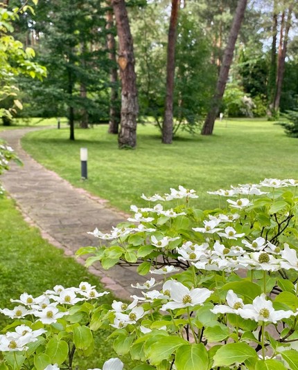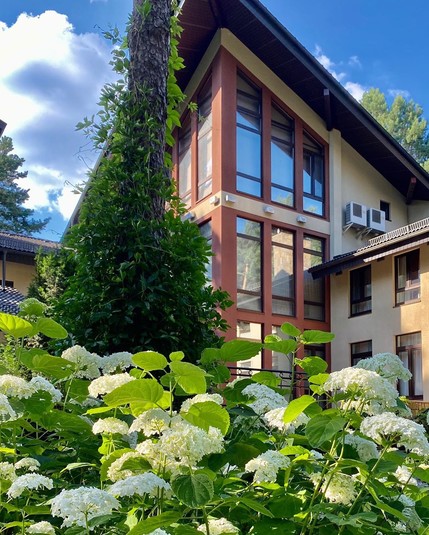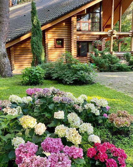 По периметру дом окружен забором, его охраняет сторож. Внутри есть домик для гостей, беседка и мангал. При этом сама хозяйка любит проводить время на грядках, а также ухаживать за плодовыми деревьями.